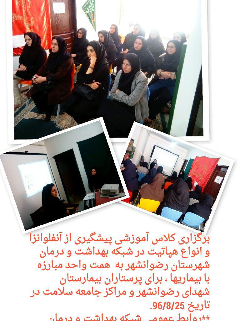 کلاس پیشگیری از بیماری آنفلوانزا و انواع هپاتیت برای پرستاران بیمارستان شهدای رضوانشهر و مراکز جامعه توسعه سلامت به همت واحد درمان وبا اجرای واحد مبارزه با بیماریهای  شبکه بهداشت رضوانشهر در سالن اجتماعات شبکه  برگزار گردید که در این کلاس آموزشی 12 نفر از پرستاران تحت آموزش قرار گرفتند
